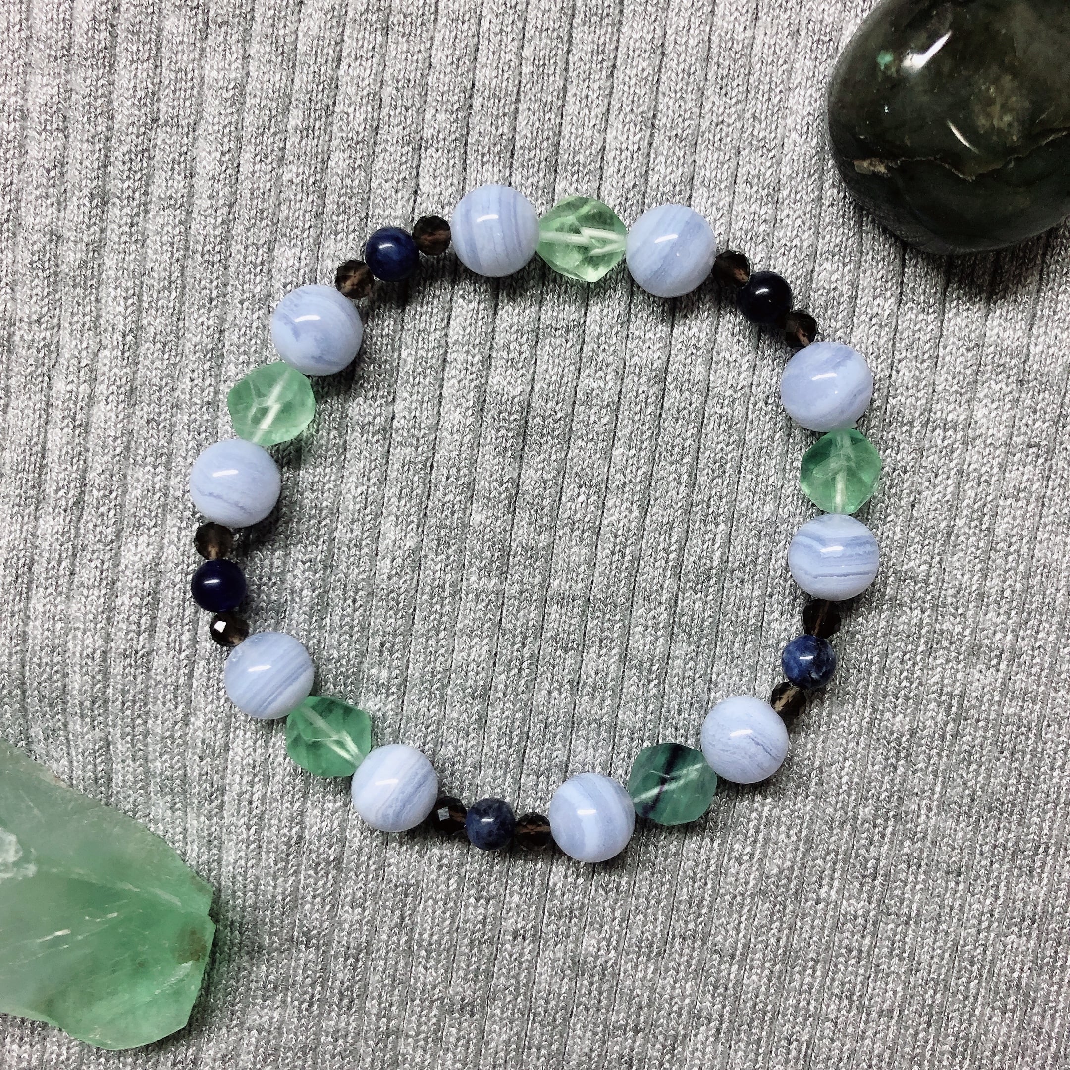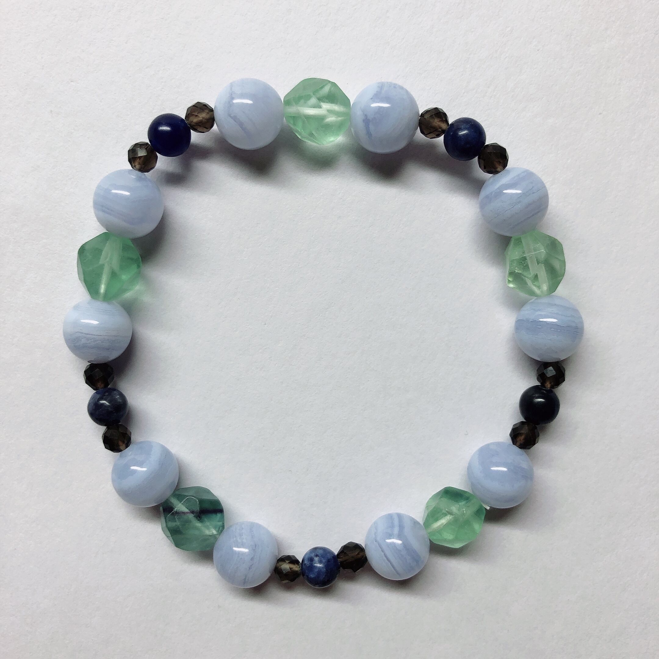 フローライトは感性を磨き、才能開花を導きます。緑色は感情の保護をしてくれます。ブルーレースアゲートは感情を緩やかに解放し、自己表現力やコミュニケーション能力を高める石です。スモーキークォーツは不安や焦りを鎮め、安らぎを与えてくれます。ソーダライトは邪念や恐怖心を取り除き、意志や忍耐力を強化する石です。