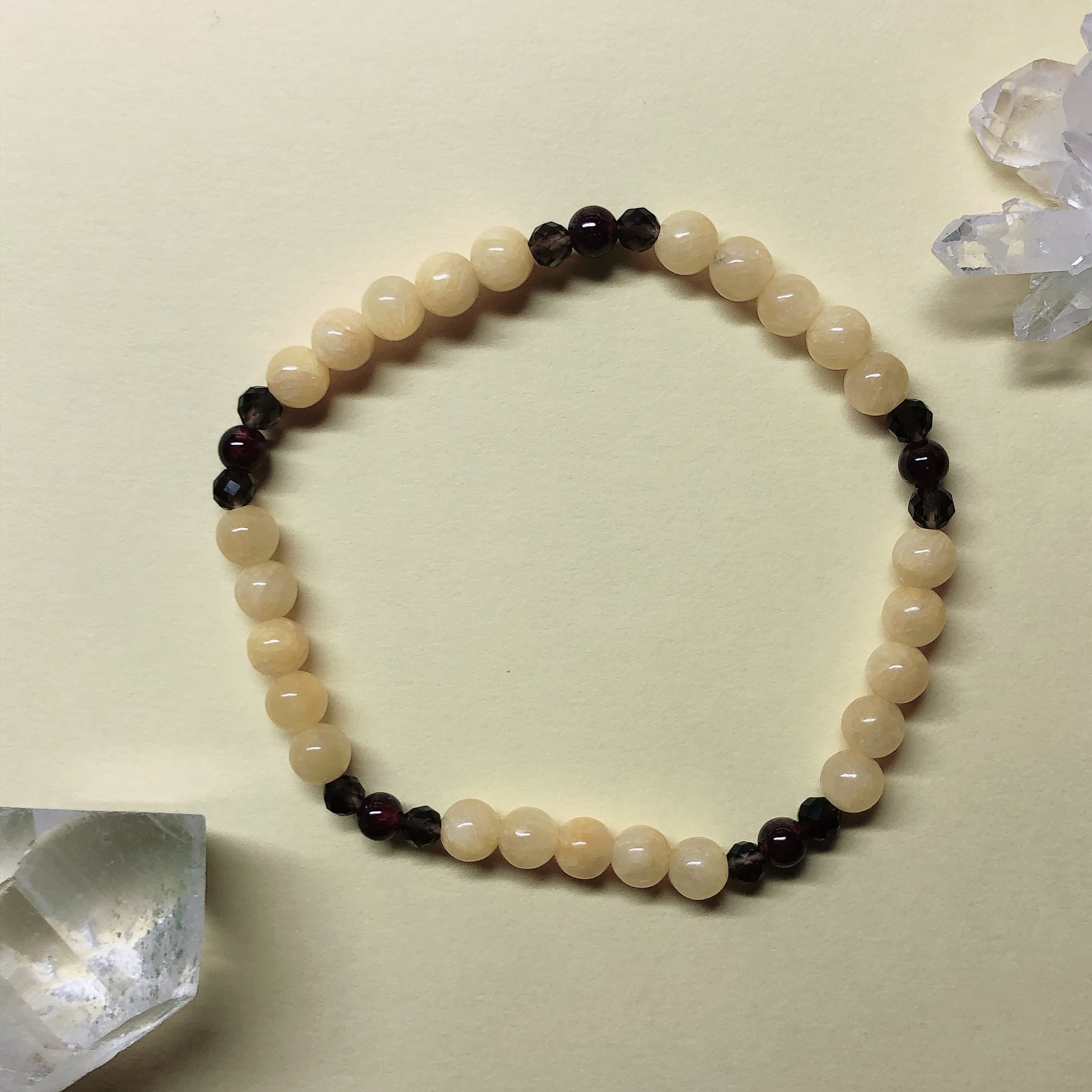 レッドガーネットは魅力や快活さを引き出す、愛と情熱の石です。スモーキークォーツは不安や焦りを鎮め、安らぎを与えるヒーリングの力があります。アラゴナイトは魅力を高め、良い出会いを引き寄せます。
